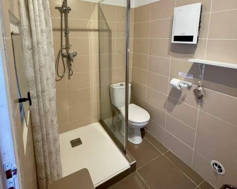 La salle de bain dispose d'une douche, les serviettes, gel douche et sèche-cheveux sont fournis.
